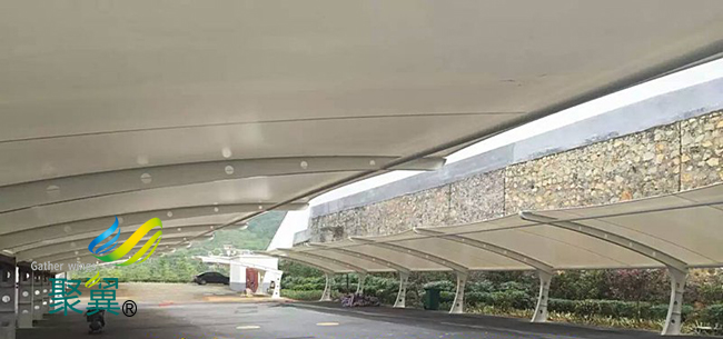 膜結構車棚的整個聯接安全、合理、秀麗;聯接件具有強度、剛度和耐久性,應不先于所聯接膜結構車棚膜材、拉索或許鋼構件損壞,聯接處膜材應不先于其它部位膜結構車棚膜材損壞。